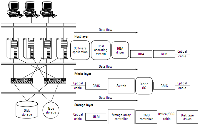 - SAN Fabric – consists of all the individual switched fabrics in the SAN