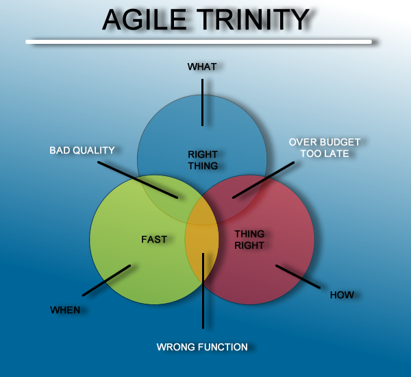 This should simplify your approach to Agile management. The concept is to stay in the center 'sweet spot'. Gravitating into one state of mind has an equal effect on the Agile balance. Staying in the zone, means the client gets what they need, its built well, and project cost is competitive.